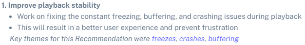 For instance, a customer with a streaming app, our analysis identified the playback stability issues and the Customer added alerts for terms like ‘crash’ and ‘buffer,’ enabling proactive response to customer-reported issues.