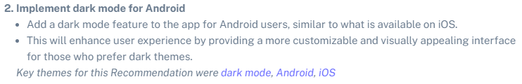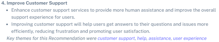 We’re thrilled to share that our AI Recommendations feature has now generated over 500 valuable product recommendations, all derived from customer feedback and reviews. Below, we present some real-life examples showcasing what our customers encounter. Each recommendation not only identifies the issue but also suggests fixes, explains the importance of addressing it, and highlights the underlying themes prompting the suggestion.